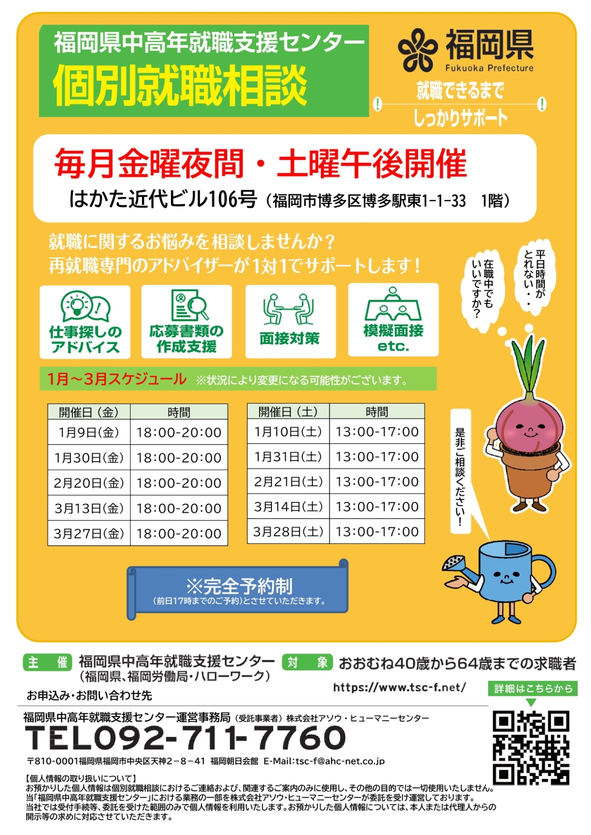 金曜夜間・土曜午後に福岡県中高年就職支援センターで個別就職相談を開催いたします!